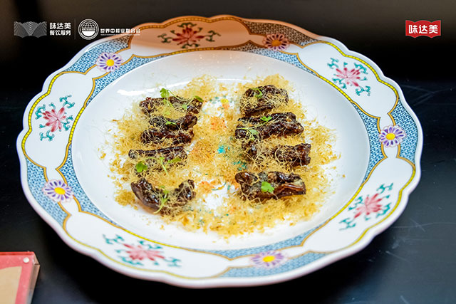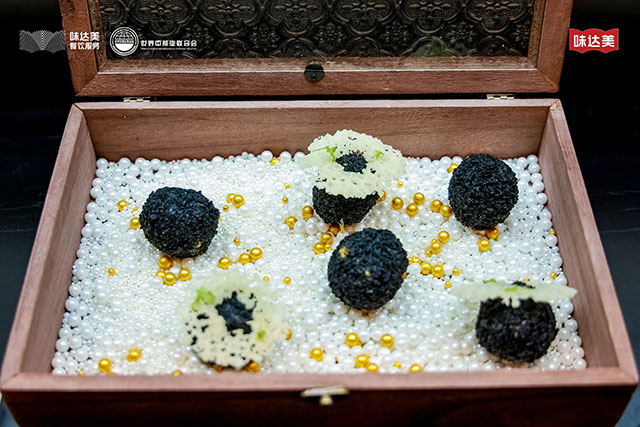 以闽菜经典小吃“五香卷”为灵感,并借鉴淮扬狮子头的技法,将黄鳝与猪肉剁碎后,加入味达美麻辣嗨鲜汁与味达美酸汤酱腌制 15 分钟,去腥并提升鲜味与酸辣层次,再与红薯粉、马蹄、葱混合摔打成馅,裹蛋液、淀粉与黑色面包糠油炸至酥脆。一口咬开,外酥内润,鲜味在微微酸辣后味中爆发,嗨鲜汁的加入让鳝鱼的本味更立体。