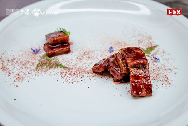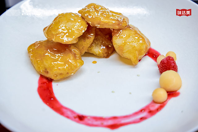 创作思路是将经典糖醋里脊做成“果味新解”,展现追求食材本味的理念,与味达美的产品特色相契合,更加健康又有新意。猪里脊用盐水加百里香、花椒、小茴香、八角等浸泡,入底味并使其更软嫩,再裹上鹰粟粉,七成油温炸至定型,复炸后外酥里嫩。将鲜山楂和车厘子打碎过滤自制果酱,提酸解腻,补甜增香,风味天然。熬制酱汁时加入味达美味极鲜酱油、味达美清香米醋,以 80℃ 熬煮,咸鲜衬托酸甜,果香呼应。最后点缀冻干山楂粉末,层次丰富,更添喜庆氛围。